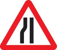 57639: Road narrows left fold up 750mm triangle sign with text variant