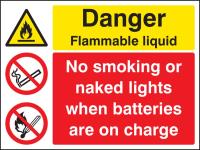 16208Q: Flammable liquid no smoking/naked lights batteries on charge Material: 1: Rigid Plastic Size: Q (600x450mm)