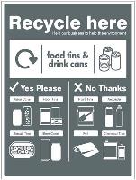 16677H: Food tins and drink cans - WRAP Recycle here sign Material: 1: Rigid Plastic Size: H (300x250mm)