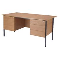 Spacious desk with modesty panel and 18mm thick MDF desktop. Rectangular shape allows you to fit together multiple desks. Sturdy metal legs. Supplied with 1 x 2 drawer and 1 x 3 drawer pedestal. Size: W1800 x D750 x H730mm. Finish: Bavarian Beech.