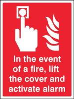 11079K: In the event of a fire lift the cover and activate alarm Material: 1: Rigid Plastic Size: K (400x300mm)