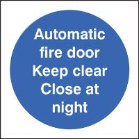 21617U: Automatic fire door keep clear close at night Material: 2: Self Adhesive Vinyl Size: U (100x100mm)