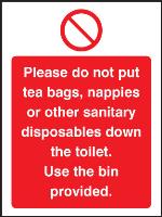 23629A: Please do not put tea bags etc down toilet use bins provided Material: 2: Self Adhesive Vinyl Size: A (100x75mm)