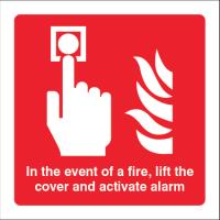 21079C: In the event of a fire lift the cover and activate alarm Material: 2: Self Adhesive Vinyl Size: C (150x150mm)